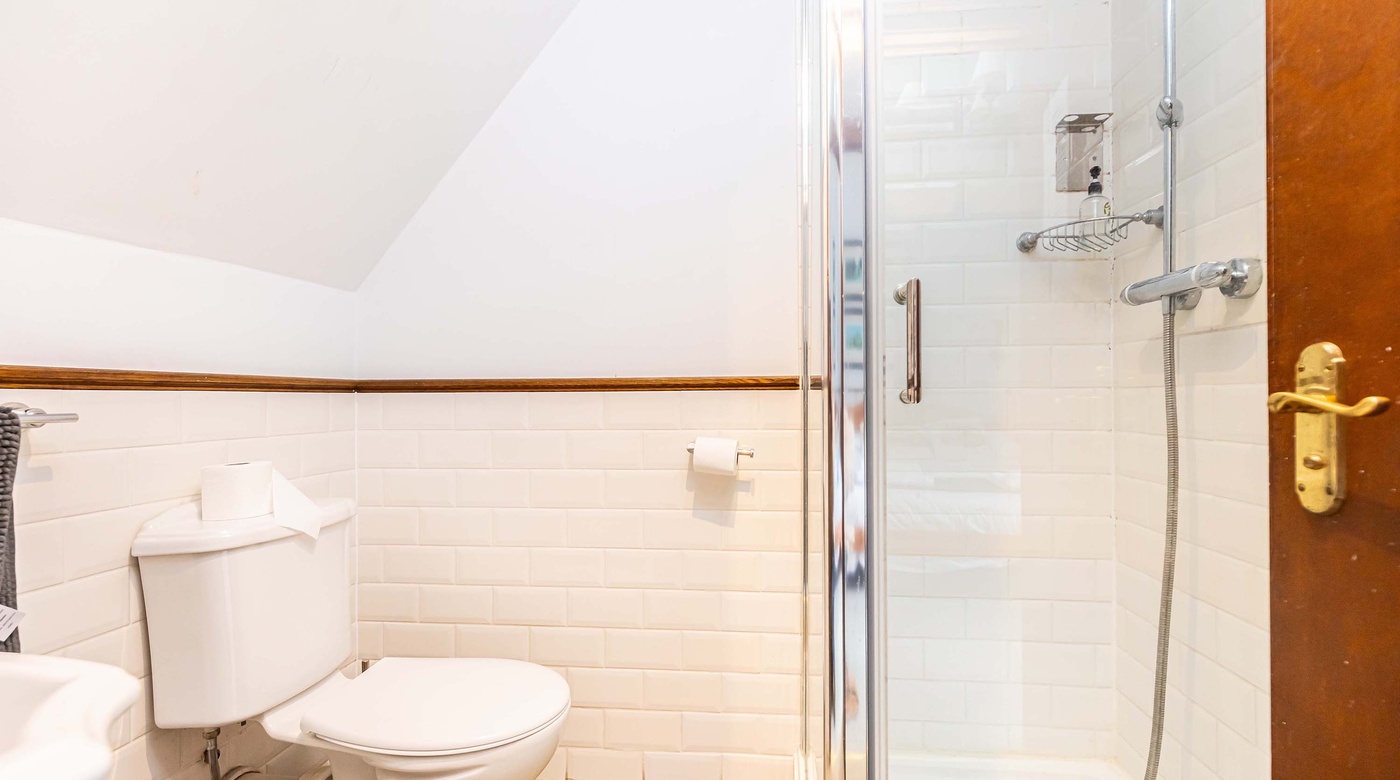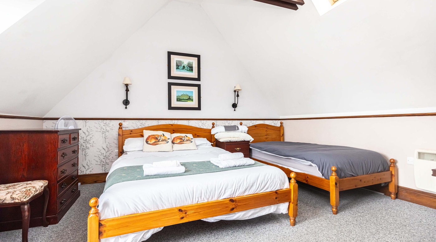 Private accommodation is accessed from the rear and includes two double bedrooms, a living room, an office with access to attic storage, a kitchen, and a bathroom/WC. The layout is flexible — the living room can easily become a third bedroom if needed. The accommodation is well decorated and in good overall condition.